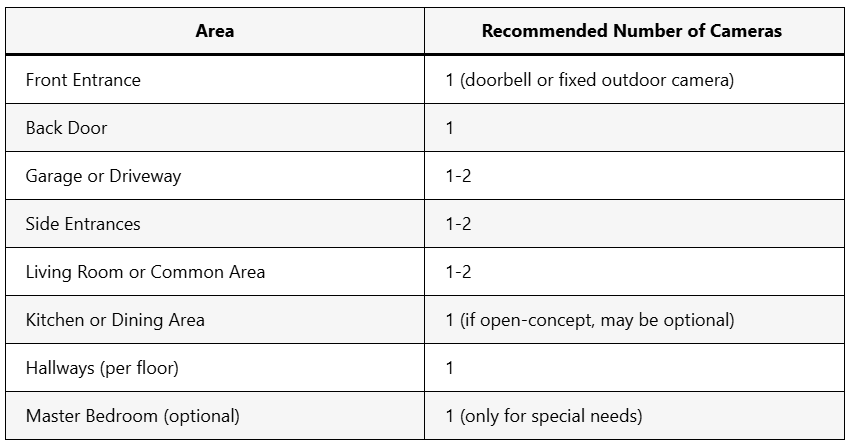 You’ll need fewer cameras if your home is compact or open-concept. In multi-level homes, stairs or second-floor hallways often serve as monitoring chokepoints.