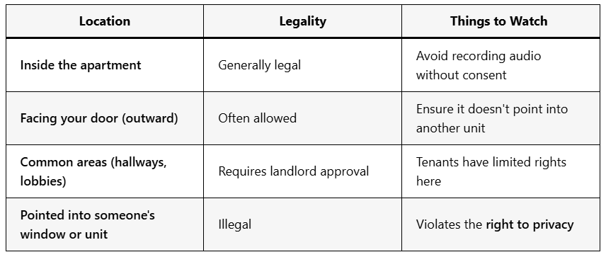 Keep in mind: Cameras inside are legal, but could still raise privacy concerns with roommates or visitors. It’s best to communicate openly if cameras will be present inside your apartment.